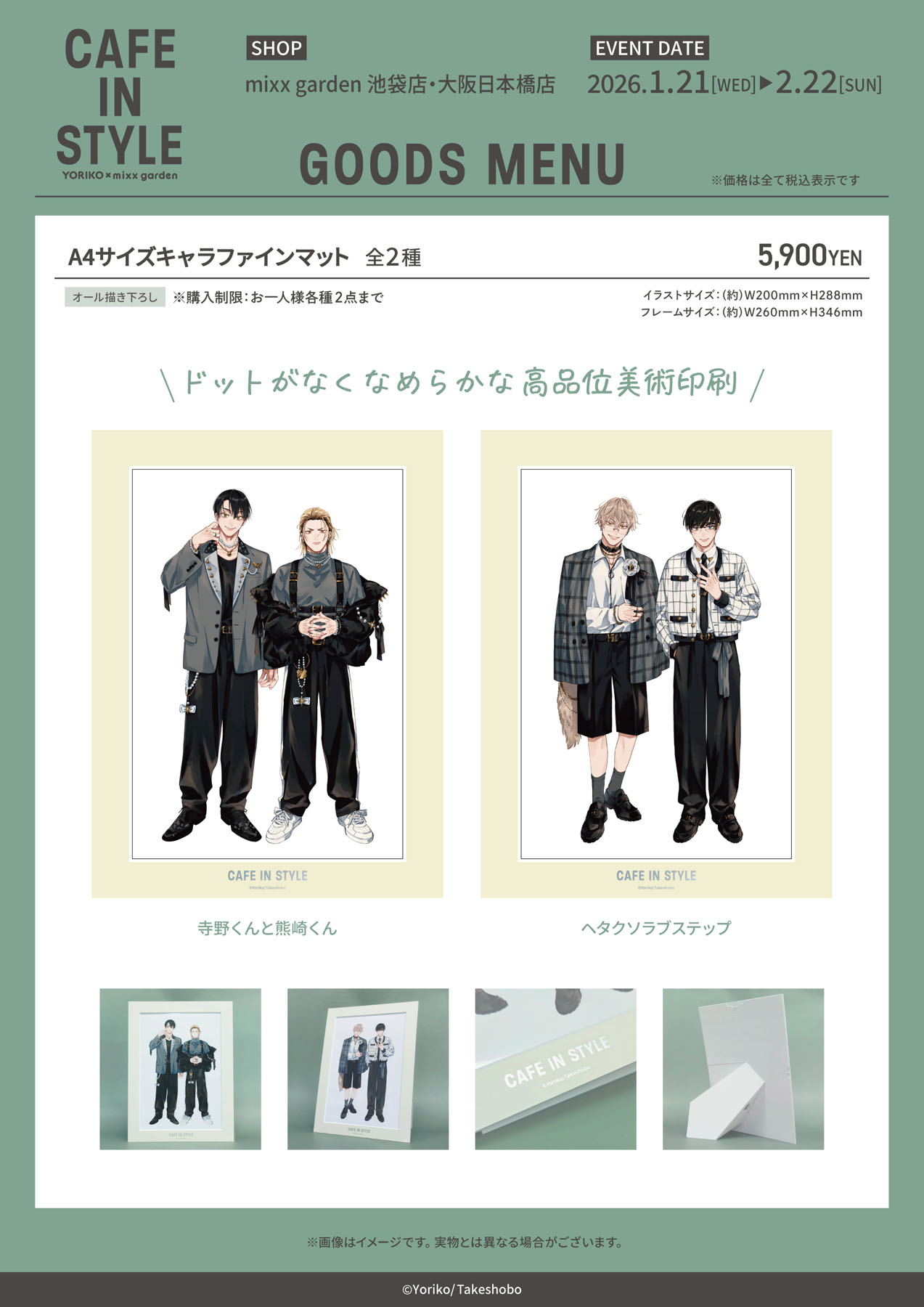 ご来店または通販でご購入いただいた際のお気に入りメニューやグッズのご感想を #CAFE_IN_STYLE を付けて投稿してくださった方に≪依子先生直筆サイン入りハート型イラストカード(ノベルティ)≫を抽選でプレゼント!