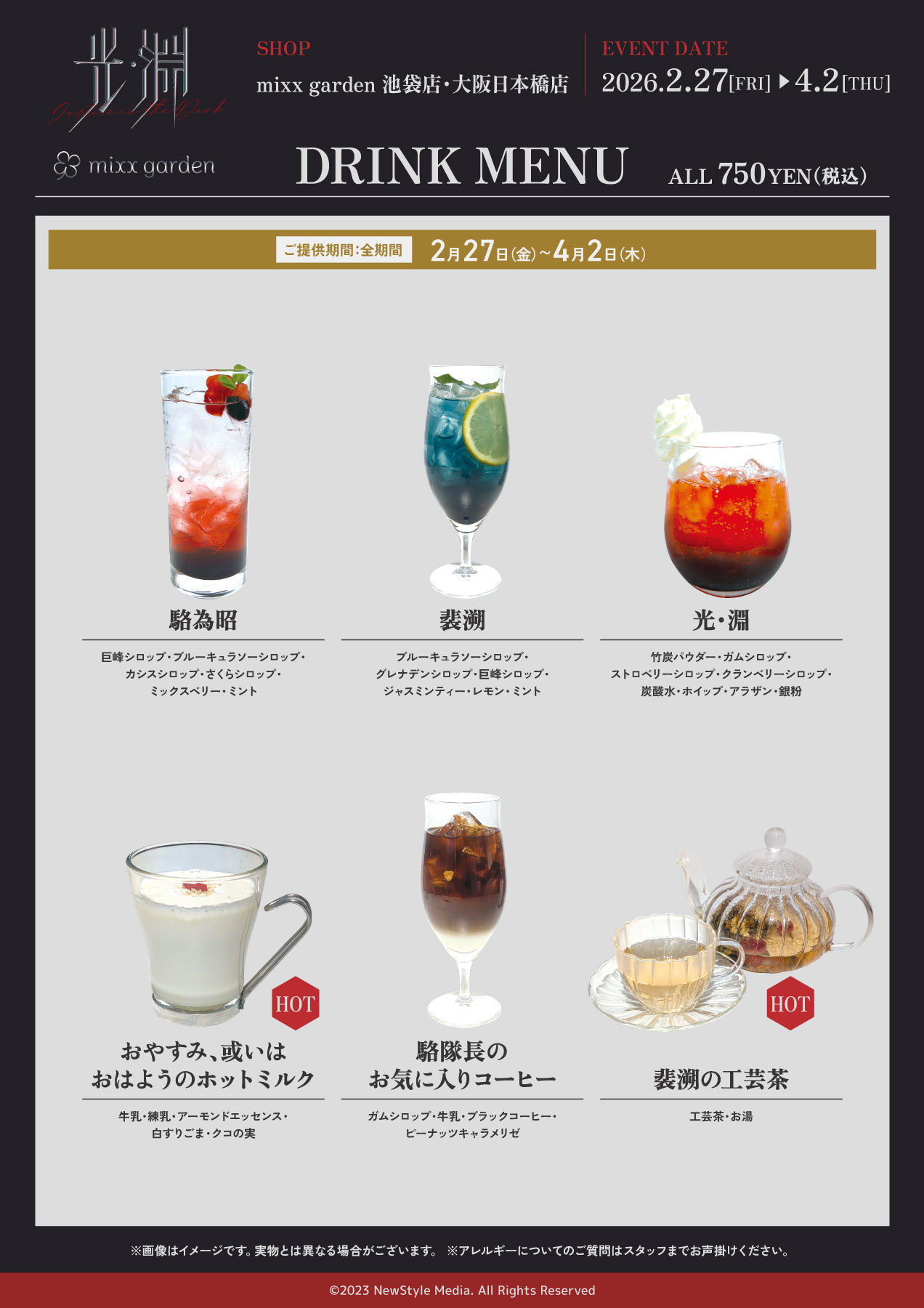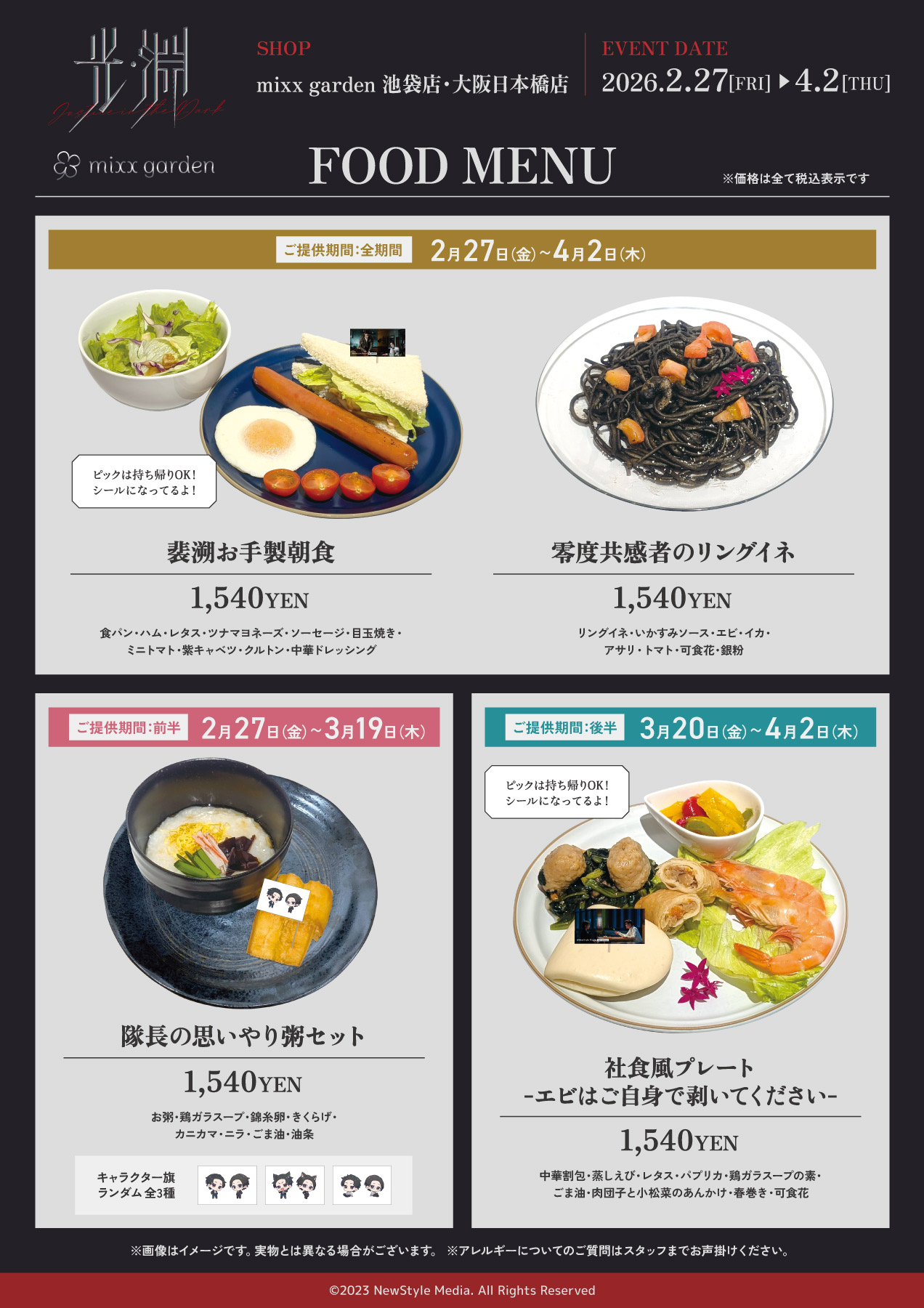 - グッズ・ノベルティ・ご提供メニューはお品切れになる場合がございます。販売をお約束するものではございませんので、あらかじめご了承ください。